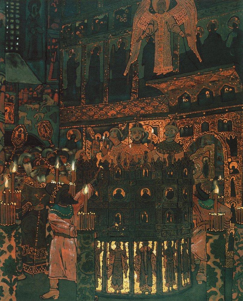 Русский художник Николай Рерих "Пещное действо (XVII век), 1907. Эскиз декорации для постановки мистерии Три волхва в Старинном театре в Петербурге" |